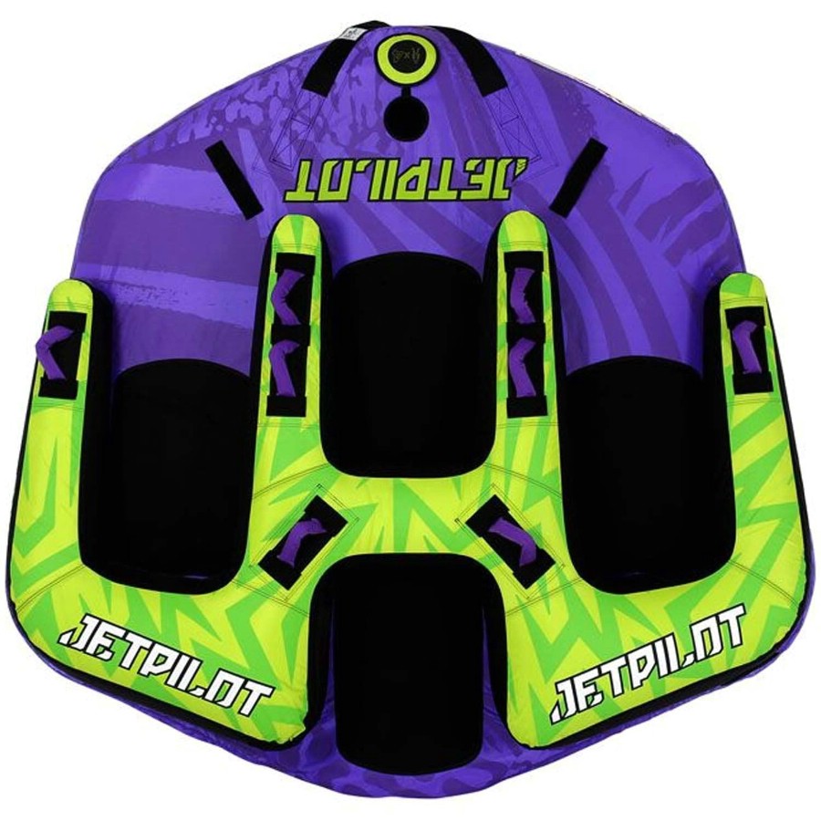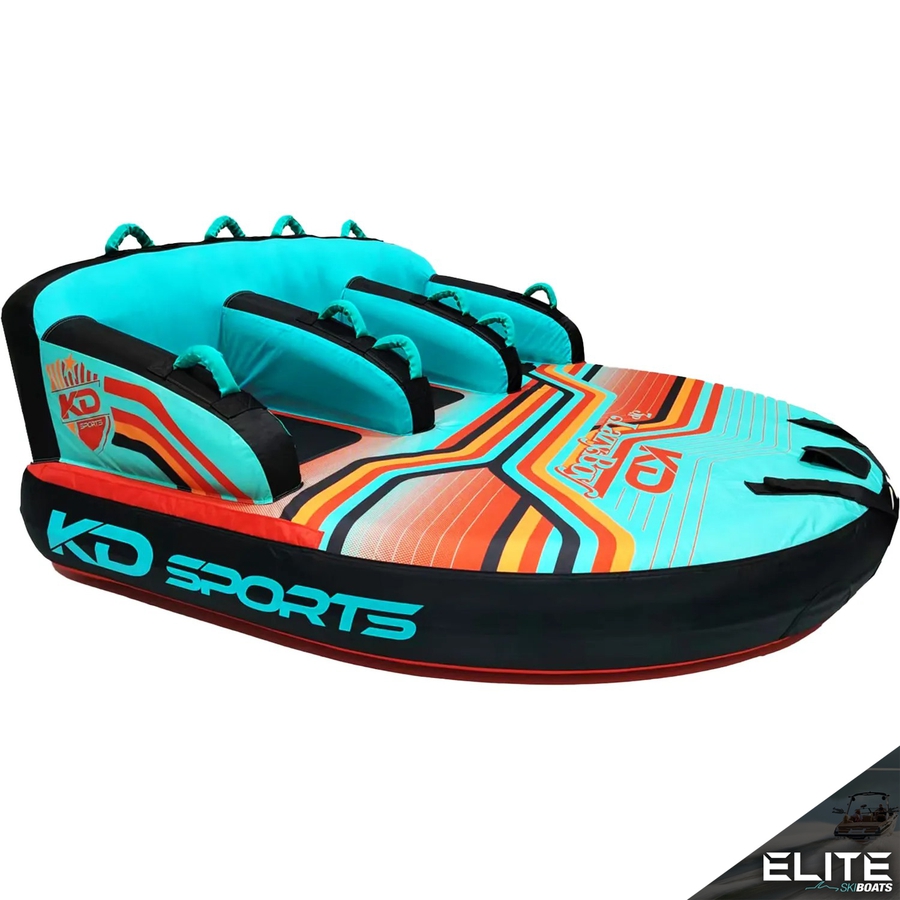 This cockpit design pairs the comfort of a sofa style with the performance of a winged style tube! Doubling the value, it’s fitted with an extra tow point to rear of the Bandwagon, so once you’ve finished lounging in the couch position just spin it around and kneel for a white knuckled chariot ride. The aptly named KD Bandwagon allows riders to sit up high and clear from the water, it’s cart like design recesses riders within an inflatable cushioned backrest that extends the entire back half of the tube, the middle rider is sat slightly forward too, helping to avoid accidental collisions with other passengers.